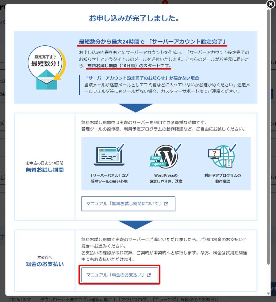 あなた専用のサーバーアカウントの設定が完了すると、「サーバーアカウント設定完了のお知らせ」というメールが届きます。