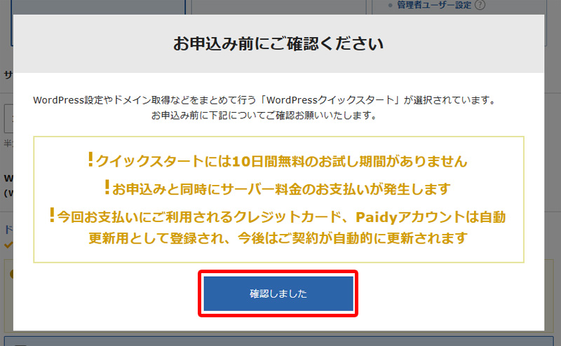 クイックスタート申し込み時の注意事項が表示されますので、確認後「確認しました」をクリックします。