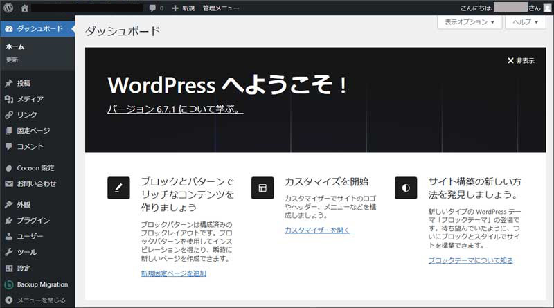 以下のようなダッシュボード画面が表示されれば、ログイン成功です。これがWordPressの管理画面です。
